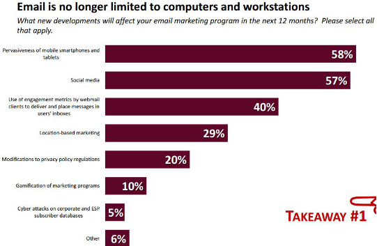 另据MarketingSherpa对全球1035名市场营销人员的调研显示,移动智能手机和平板(58%)、社交媒体(57%)、网页邮件的互动策略使用(40%)、把邮件投入用户邮箱(40%)、基于本地化营销(29%)、隐私政策规则的跳整(20%)、营销活动游戏化(10%)、网络攻击企业和ESP数据库(5%)、其他(6%)。
