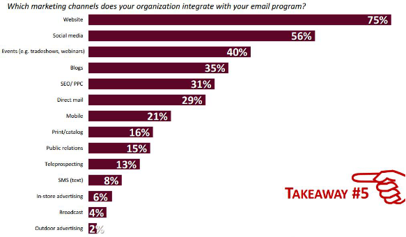 目前邮件已经与越来越多的渠道进行了结合。受访者认为他们在邮件渠道在与其他渠道进行整合上的比例分别是:网站(75%),社交媒体(56%),事件活动(40%)、博客(35%)、SEO/PPC(31%),直邮(29%),移动(21%),印刷/目录(16%),公共关系(15%),电话机会管理(13%),SMS(8%),店内广告(6%),广播(4%),户外广告(2%)。
